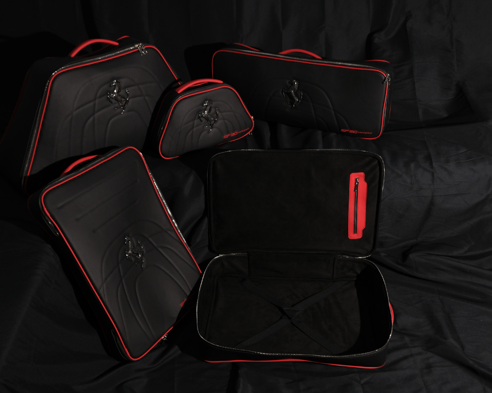 Elevate your Ferrari SF90 experience with a custom-designed 5-piece luggage set crafted to seamlessly fit every unique space within your supercar. Engineered to maximize both style and functionality, this luxurious set includes: